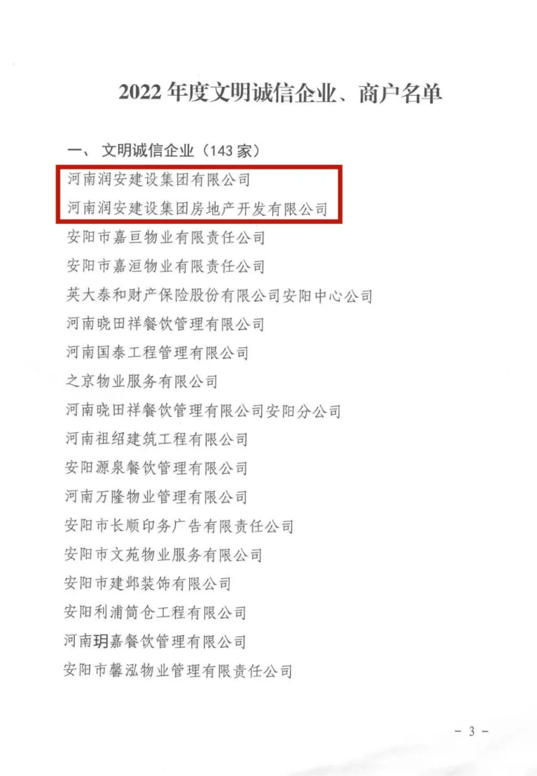 近日,安陽市精神文明建設指導委員會辦公室、安陽市市場監(jiān)督管理局聯(lián)合印發(fā)《關于命名2022年度安陽市“文明誠信企業(yè)、文明誠信商戶”的決定》。河南潤安建設集團有限公司、河南潤安建設集團房地產(chǎn)開發(fā)公司雙雙榮登“安陽市2022年度文明誠信企業(yè)”榜單,分別名列榜單第1名和第2名。